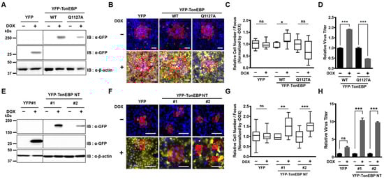 Next, we examined the effects of cleaved TonEBP—the N-terminal fragment of TonEBP (TonEBP NT, i.e., TonEBP 1-1127). We used two independent colonies of U2OS cells expressing doxycycline-inducible TonEBP NT (Figure 3E). The focus-forming assay revealed that the expression of TonEBP NT increased the number of infected cells per focus in both colonies, confirming that cleavage of TonEBP enhances viral propagation (Figure 3F,G). The number of viruses released from infected cells also increased dramatically by the expression of TonEBP NT in both colonies (Figure 3H). Combined with the previous data (Figure 3A–D), these results demonstrate that NSP5-mediated cleavage of TonEBP promotes the expansion of HCoV-OC43.