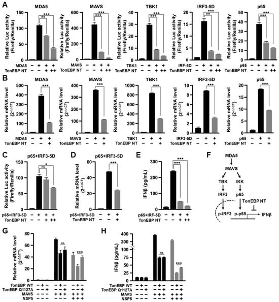 Cleaved TonEBP blocks viral induction of IFN-β. (A) HEK293T cells were transfected for 24 h with an IFN-β promoter luciferase reporter plasmid and pRL-TK in combination with a plasmid expressing MDA5, MAVS, TBK1, IRF3-5D, or p65 (see (F) below for the signaling pathway), along with various amounts of expression plasmid encoding TonEBP NT, as indicated, before analyses of luciferases. (B) The cells were transfected for 24 h with one of the plasmids expressing MDA5, MAVS, TBK1, IRF3-5D, or p65, without or with the expression plasmid for TonEBP NT, as indicated. The level of IFN-β mRNA was then determined using RT-qPCR. The transcript level of IFN-β was normalized to the expression of GAPDH. (C) Cells were transfected and analyzed as in (A) except that two expression plasmids for IRF3-5D and p65 were used instead of single plasmid for the signaling molecules. (D) Cells were transfected and analyzed as in (B) except that two expression plasmids for IRF3-5D and p65 were used instead of single plasmid for the signaling molecules. (E) Cells were transfected as in (D) for 48 h except for variable amounts of the plasmid for TonEBP NT, and IFN-β in the culture media were measured using enzyme-linked immunosorbent assay. (F) A model for the inhibitory role of cleaved TonEBP (TonEBP NT) in the MDA5–IFN-β signaling pathway. (G) Cells were co-transfected for 24 h with various combinations of four plasmids expressing TonEBP WT, TonEBP Q1127A, MAVS and SARS-CoV-2 NSP5, as indicated. The level of IFN-β mRNA was then determined using RT-qPCR. The transcript level of IFN-β was normalized to the expression of GAPDH. (H) Cells were co-transfected for 48 h with various combinations of four plasmids expressing TonEBP WT, TonEBP Q1127A, MAVS and SARS-CoV-2 NSP5, as indicated. IFN-β in the culture media were measured. Data are shown as the mean ± SEM, n = 3; ns p > 0.05, * p < 0.033, ** p < 0.002, and *** p < 0.001 using t-tests.