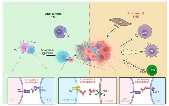 Compared to normal skin, which has a lower population of FOXP3+ Treg cells, TSCC and cSCC exhibit an increased presence of these cells [56]. FOXP3+ Treg cells play a critical role in maintaining immune homeostasis [57], preventing autoimmune diseases [58]. However, they also contribute to a pro-tumor environment by suppressing anti-tumor immunity [59,60]. Their presence in the TME is likely due to their recruitment from the bloodstream, as they do not proliferate locally within the tumor [61]. In immunocompromised patients, FOXP3+ Treg cells constitute more than half of the T cell infiltrates in cSCCs. These cells express markers such as CCR7 and L-selectin [50] (Figure 1). Specifically, Treg cells can regulate the immune response by suppressing the proliferation and cytokine production of effector T cells [62,63]. Several studies have indicated that a higher number of tumor-infiltrating Tregs is associated with poor prognosis and lower survival rates in breast, ovarian, and gastric carcinomas [59,64,65,66]. Tregs may play a role in cSCC metastasis and potentially have prognostic significance [67]. In cSCC, the regulatory activity of CD8+ Tregs is more pronounced compared to that of CD4+ Treg cells [68,69,70]. Imiquimod has been found to effectively inhibit the immunological destruction of cSCC by decreasing the number of FOXP3+ Treg cells and inhibiting Treg cell function [61]. Research findings indicate that BCC samples exhibit a high presence of tumor-associated Treg cells in the TME while having a relatively low proportion of stromal tumor-infiltrating lymphocytes (sTILs) [71] This is supported by another study in which BCCs showed a high stromal FoxP3+ to CD4+ T cell proportion [72]. Pro-tumoral TMEs are characterized by a dominance of Treg cells and other immunosuppressives cells (Table 1) [73]. Whereas, anti-tumoral TMEs are populated by more CD8+ T cells and dendritic cells, among others (Figure 1) [73]. These TME classifications have implications for immunotherapy response, with anti-tumoral TMEs generally showing better outcomes in response to ICI than pro-tumoral TMEs [74]. Therefore, alternative therapeutic strategies for pro-tumoral TMEs need to be further explored [71,75].