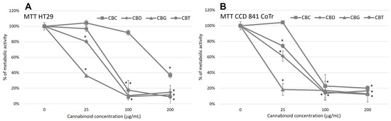 MTT analysis of the metabolic activity of HT29 cells (A) and CCD 841 CoTr cells (B) after 24 h of incubation with the tested cannabinoids. * A p-value of ≤0.05 is considered significant.