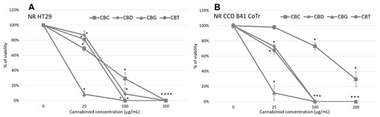 NR uptake assay analysis of the viability of HT29 cells (A) and CCD 841 CoTr cells (B) after 24 h of incubation with the tested cannabinoids. * A p-value of ≤0.05 is considered significant.