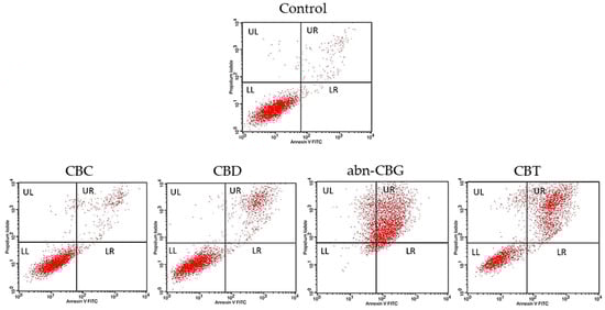 In a further flow cytometric study measuring normal and tumor cell death types, the cells were exposed to the cannabinoids at a concentration of 25 μg/mL for 24 h.