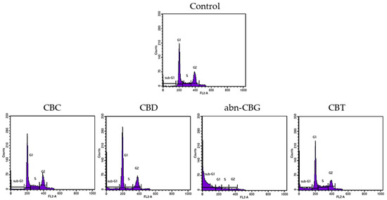 The tested cannabinoids also significantly influenced changes in the distribution of normal cells in the cell cycle phases. CBC reduced the number of cells in the sub-G1 phase by 6.96%, compared to the control, which indicates an anti-apoptotic effect, and limited the transition of cells from the S to G2 phase. CBD significantly increased the number of cells in the sub-G1 phase by 21.88%, and thus significantly reduced the number of cells in the other phases, compared to the control. The abn-CBG activity was mainly related to the accumulation of cells in the sub-G1 phase (an increase of 53.97%, compared to the control), which indicates, similarly to the CBD preparation, a pro-apoptotic effect. The CBT preparation increased the number of cells in the sub-G1 phase by 6.71% and caused the accumulation of cells in the S phase, compared to the control (Figure 6 and Table 6).