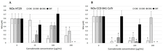 Level of nitric oxide (NOx) released in the culture of HT29 (A) and CCD 841 CoTr (B) cells, analyzed with the Griess method. Cells were incubated for 24 h with the cannabinoids (0–200 μg/mL). The columns show the mean and bars ± SD. The experiments were repeated three times. A * p-value of ≤0.05 is considered significant. The control NOx level is compared to the samples.