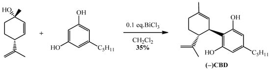 CBD, CBG, and abn-CBG (abnormal CBG) can be prepared using several synthetic methods [27,28,29,30]. The most widely exploited and readily available synthetic procedure involves a one-step Friedel–Craft allylation of olivetol with a suitable chiral terpene in the presence of Brönsted or Lewis acid catalysts [31]. For our synthesis, (-)CBD was achieved by the stereoselective reaction of olivetol with (1S,4R)-1-methyl-4-(prop-1-en-2-yl)cycloex-2-enol employing 0.1 eq. BiCl3 (Scheme 3). In methylene chloride, after 90 min., the target cannabinoid was obtained, with a final yield of 35%.