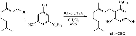 The regioisomer of natural CBG, abnormal CBG, was prepared via the Lewis acid-catalyzed reaction of olivetol with geranyl. The reaction was performed in methylene chloride at room temperature in the presence of silica gel for 1.5 h. The use of p-toluenesulfonic acid (pTSA) in an amount of 0.1 eq as a catalyst was found to produce the target compound in satisfactory yields of up to 45% (Scheme 4). Pure abn-CBG was isolated from the reaction mixture by column chromatography.