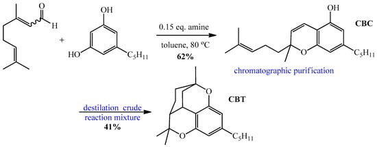 A 2-neck round bottom flask (100 mL), equipped with a distilling trap and a reflux condenser, was loaded with olivetol (3.6 g, 18 mmol, 1.00 equiv.), citral (3.4 mL, 20 mmol, 1.1 equiv.), and toluene (125 mL), and next polymer-bound tris(2-aminoethyl)amine (0.64 g, 2.7 mmol, 15 mol%) was added. The resulting solution was stirred at reflux while being monitored by HPLC analysis until it showed no further signs of consuming the remaining olivetol. The reaction mixture was then cooled to room temperature. The reaction mixture was filtered through a pad to remove the amine-catalyst, and the solvent was removed under vacuum. Then, the reaction mixture was distilled under vacuum at 0.1 mbar, but the crude oil bubbled for some time. The yellow oil began to distill at about 115 °C (0.1 mbar) to obtain 2.32 g (41%) of brown oil of CBT. 1H NMR (500 MHz, CDCl3): δ 6.35 (d, J = 0.8 Hz, 1H), 6.30 (d, J = 1.3 Hz, 1H), 2.87 (dt, J = 4.5, 2.0 Hz, 1H), 2.55–2.50 (m, 2H), 2.24 (ddd, J = 13.2, 4.7, 3.1 Hz, 1H), 2.04 (ddd, J = 11.5, 5.3, 2.8 Hz, 1H), 1.85 (dd, J = 13.1, 1.7 Hz, 1H), 1.78 (dddd, J = 14.9, 6.2, 3.2, 1.4 Hz, 1H), 1.63–1.55 (m, 2H), 1.54 (s, 3H), 1.44 (ddd, J = 13.1, 8.1, 6.6 Hz, 1H), 1.40 (s, 3H), 1.36–1.21 (m, 5H), 1.03 (s, 3H), 0.91–0.87 (m, 3H), 0.63 (tdd, J = 13.5, 11.5, 6.1 Hz, 1H). 13C NMR (126 MHz, Chloroform-d) δ 156.87, 156.56, 142.57, 124.26, 114.09, 109.80, 108.92, 83.61, 74.51, 46.79, 37.36, 36.16, 35.37, 31.43, 31.02, 29.76, 29.10, 28.12, 23.76, 22.56, 22.16, 14.06. IR (ATR): 2970, 2954, 2927, 2872, 2856, 1619, 1585, 1429, 1365, 1162, 1128, 1086 cm−1.