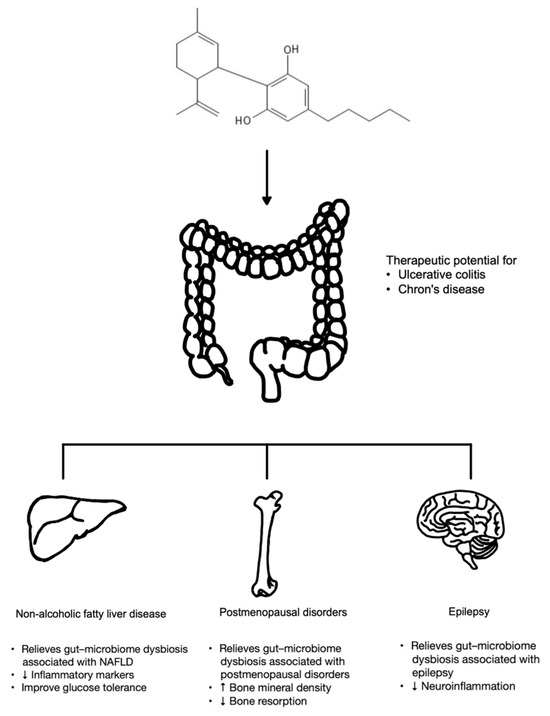This section describes previous studies investigating the effects of CBD on various specific elements of the gut microbiome. Since the microbiome has an impact on the health of multiple organ systems, these studies have also examined the correlation between the effects of CBD on the gut microbiome and its impact on diseases such as IBD, non-alcoholic fatty liver disease (NAFLD), postmenopausal disorders, epilepsy, and multiple sclerosis (Figure 2 and Table 4).