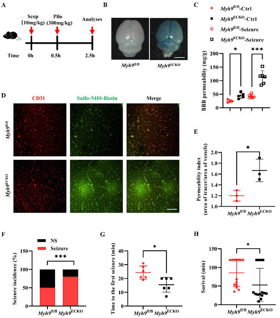 To investigate this hypothesis, we initially established an epilepsy model using Pilocarpine (Pilo), a classical method for inducing seizures. Mice were first administered Evans blue or Sulfo-NHS-Biotin tracers intravenously, followed by intraperitoneal injection of scopolamine, and then Pilo to induce seizures. Over the 120 min following Pilo administration, the mice were closely monitored. Seizure scores were recorded, along with the timing of seizures and mortality (Figure 2A). The results indicate that, compared to the controls, Myh9ECKO mice showed increased brain tissue levels of Evans blue and a higher proportion of Sulfo-NHS-Biotin leakage from cerebral vessels, suggesting enhanced BBB permeability in this Pilo-induced epilepsy model (Figure 2B–E). A further analysis revealed that Myh9ECKO mice had a higher rate of seizures (Figure 2F) and experienced their first seizure in a shorter period (Figure 2G). Additionally, a higher mortality rate following seizures was observed in Myh9ECKO mice compared to the controls, with most succumbing within 120 min post-administration (Figure 2H). These findings suggest that Myh9^ECKO mice are more susceptible to Pilo-induced epilepsy and suffer more severe outcomes.