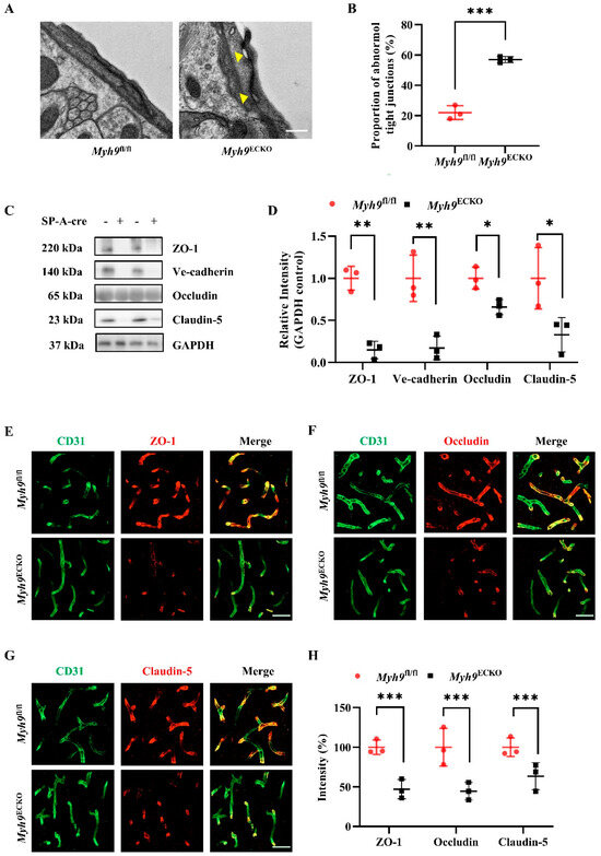 The findings presented above demonstrate that the endothelial-specific knockout of Myh9 disrupts the integrity of the BBB, and this disruption exacerbates damage caused by brain diseases. However, the specific mechanisms by which Myosin IIA regulates BBB integrity remain unclear and warrant further investigation. ECs in the brain are connected by specialized tight junctions and express crucial transport proteins, playing a vital role in maintaining the BBB. Additionally, extensive research has shown that the normal function of the BBB is maintained by a complex interplay among Ecs, pericytes, astrocytes, and the basement membrane, with Ecs regulating the surrounding microvascular cells to support the BBB [10,11,12,13,14]. We primarily explore the specific mechanisms by which Myosin IIA deficiency in the brain endothelium contributes to BBB damage from two aspects: first, whether Myosin IIA deficiency in brain endothelium disrupts tight junction structures or alters the expression of critical endothelial molecules; second, whether Myosin IIA deficiency affects the function of pericytes and astrocytes within the BBB.