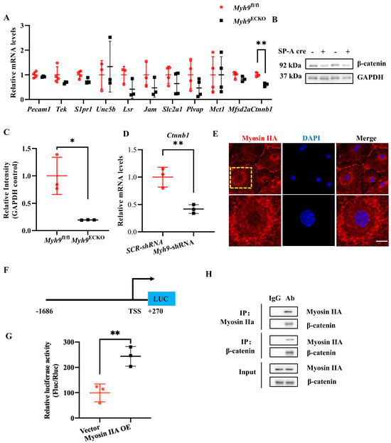 Our study confirmed that β-catenin acts as a key downstream molecule in the regulation of brain endothelial barrier function by Myosin IIA. It explored the possible mechanisms by which brain endothelial Myosin IIA regulates β-catenin, finding that the transcription level of the Ctnnb1 gene in the Myh9ECKO mouse brain endothelium was significantly reduced. The literature research revealed that, in a mouse model of gastric cancer, Myosin IIA in cancer cells can form complexes with other molecules and bind to the promoter region of the Ctnnb1 gene to mediate its transcriptional expression [55]. Initially, we employed immunofluorescence staining to detect the expression of Myosin IIA in the nuclei of brain ECs, followed by constructing a luciferase reporter plasmid containing the Ctnnb1 gene promoter fragment. The results from the dual-luciferase reporter system suggest that Myosin IIA in brain ECs can mediate the transcription of Ctnnb1, although it does not rule out the possibility that Myosin IIA could also influence β-catenin protein expression through other mechanisms. Furthermore, we demonstrated via co-immunoprecipitation that Myosin IIA can bind to the β-catenin protein. Future studies could involve cellular or tissue staining to determine the co-localization of Myosin IIA and β-catenin, and to identify their specific binding sites. Mutations at these binding sites could be explored to investigate their impact on the integrity of the BBB.
