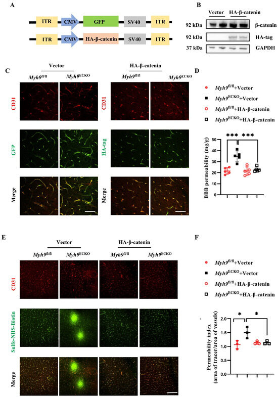 In this section, we further investigated whether the overexpression of β-catenin in vivo could reduce the permeability of the BBB in Myh9ECKO mice. The specific intervention in the brain endothelium remains a significant scientific challenge in the field. Previous studies have reported on AAV-BI30, a new serotype of AAV that can specifically and efficiently transduce ECs throughout the central nervous system, achieving stable expression in vitro human microvascular ECs, as well as in mouse and rat models [56,57]. To achieve the overexpression of β-catenin in mouse brain ECs using the AAV-BI30 system, we constructed a β-catenin overexpression plasmid tagged with HA (Figure 5A). The plasmid was transfected into 293T cells, and proteins were harvested 48 h later for Western blot analysis, which confirmed the successful expression of β-catenin in 293T cells (Figure 5B).