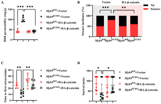 In this section, we hypothesized that overexpressing β-catenin in the brain endothelial of Myh9ECKO mice could ameliorate the damage caused by epileptic seizures. To test this hypothesis, an epilepsy model was induced by drug administration in mice 30 days after AAV injection. The results show that, compared to the GFP overexpression control group, Myh9ECKO mice overexpressing β-catenin in their brain endothelium exhibited a significant reduction in the total amount of Evans blue that leaked into the brain parenchyma, a lower rate of epileptic seizures, increased time to the first seizure, and a reduced mortality rate from epilepsy (Figure 6). These findings suggest that the overexpression of β-catenin in the brain endothelium of Myh9ECKO mice can decrease their susceptibility to epilepsy and mitigate the damage caused by epileptic seizures.