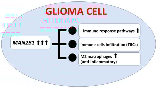 Lin et al. analyzed MAN2B1 gene expression in patients with glioma. Their results based on the RNA-seq data indicated that MAN2B1 expression was elevated in glioma and was correlated with malignant clinical and molecular features. In patients with highly expressed MAN2B1, the prognosis was poor. Additionally, frequencies of somatic mutations present in gliomas with elevated and inhibited MAN2B1 expression differed significantly. More accurate functional analyses revealed the association of high MAN2B1 expression with markers of M2 macrophages and tumor-associated macrophages. In conclusion, the level of MAN2B1 expression could be a prognostic biomarker in glioma and associated with immune infiltration; please see Figure 2 [63]. Observation made by Lin et al. is not directly connected to LSDs and oncological aspects, but it seems to be a very interesting and potential diagnostic biomarker.