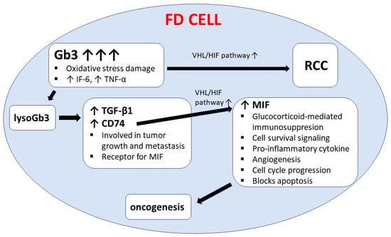 Fabry disease is one of the lysosomal storage diseases inherited in an X-linked recessive manner. It is caused by mutations in the GLA gene, leading to deficient activity of alfa-galactosidase A. As a result, globotriaosylceramide (Gb3) and its derivatives, e.g., globotriaosylsphingosine (Lyso-Gb3), are stored in the lysosomes. Noteworthy, Gb3 and lyso-Gb3 are glycosphingolipids, which were detected in elevated amounts in various types of cancer. Gb3 was identified in patients with breast, colon, pancreatic, gastric, ovarian, and testicular cancers and lymphoma [64]. Interestingly, other glycosphingolipids stored in Fabry disease, lyso-Gb3 and S-1-P, promote cell proliferation [64].