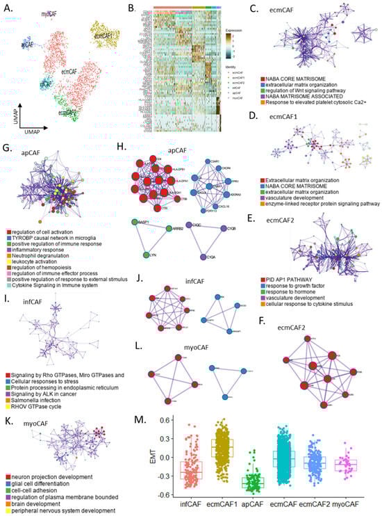 Using single-cell data from 2373 fibroblasts, we identified six CAF subgroups: ecmCAFs, ecmCAF1, ecmCAF2, infCAFs, apCAFs, and myoCAFs (Figure 1A). Based on their heterogeneity, we further classified ECM CAFs into ecmCAFs, ecmCAF1, and ecmCAF2. The top 10 marker genes for each subtype were selected [ecmCAF (CDH19, FKBP5, and ENTPD2), ecmCAF1 (SMOC2, POSTN, and ITGA1), ecmCAF2 (ZFP36, CYR61, and FOS), infCAF (RPS6, IGFBP5, and SPARC), apCAF (LYZ, HLA-DQB1, HLA-DPB1, HLA-DPA1, and CD74), and myoCAF (ERBB3, NRXN1, and COL14A1)] (Figure 1B). All ECM CAFs were connected to the NABAcore matrisome (Figure 1C,D); however, the gene profile of ecmCAF2 was enriched for activator protein 1 (AP1), vascular development biological pathways, and responses to growth factors and hormones (Figure 1E). The gene profiles of ECM CAF subtypes were enriched in Wnt signaling pathway regulation, response to the elevated platelet cytosolic Ca2+ pathway, and enzyme-linked receptor protein signaling system activity. The PPI of ecmCAF2 was related to the AP1 pathway, nerve growth factor-stimulated transcription, and the transforming growth factor-beta signaling pathway (Figure 1F). Notably, apCAFs had distinct characteristics. The antigen-presenting CAF signatures were enriched for cell activation regulation, positive immune response regulation, the inflammatory response, neutrophil degranulation, leukocyte activation, and cytokine signaling in the immune system (Figure 1G). According to the PPI analysis, apCAFs were mainly classified into four categories related to antigen processing and presentation, G alpha signaling events, the C1q complex, and synapse pruning (Figure 1H). ApCAFs are primarily regulated by the transcription factors RFXANK, RFXAP, and RFX5 (Supplementary Figure S1A). The InfCAF signatures were mostly enriched in Rho GTPase signaling, anaplastic lymphoma kinase signaling in cancer, and RHOV GTPase cycling, whereas their PPI phenotypes were primarily linked to peptide chain elongation and cellular responses to stress (Figure 1I,J). PPI analysis of the myoCAFs revealed that they were linked to ECM–receptor interactions and positive regulation of the plasma membrane and that they were enriched in neuron projection development, glial cell differentiation, and cell–cell adhesion (Figure 1K,L). MyoCAFs are primarily regulated by POU5F1, TCF4M, and TFAP2A (Supplementary Figure S1B). Epithelial–mesenchymal transition genes were enriched in ecmCAF1 (Figure 1M). Our findings are the first to establish the molecular signature of CAF subtypes at the single-cell level and identify the pathways involved in tumorigenesis.