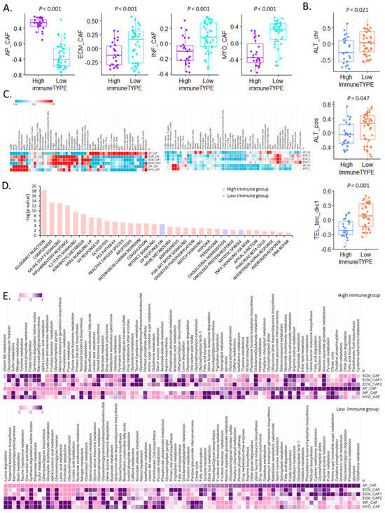 ApCAFs are enriched in the high-immunity group. (A) Box plot for apCAF, ecmCAF, infCAF, and myoCAF expression in the high- and low-immunity groups. (B) Box plot for telomere maintenance mechanism pathway activity in the high- and low-immunity groups. (C) Heat map of different CAF subtype cell types in the high- and low-immunity groups. (D) Bar graph of the p-value for cancer hallmarks in the two groups (pink, high-immunity group; sky blue, low-immunity group). (E) Heat map of 84 Kyoto Encyclopedia of Genes and Genomes metabolic pathways in the two groups (top, high-immunity group; bottom, low-immunity group).
