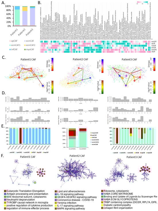 CAF subtypes show metabolic heterogeneity and distinct stem-like CAF signatures at the single-cell level. (A) Bar graph of a fraction of CAF subtypes at the single-cell level. (B) Heat map of metabolic reprogramming for CAF subtypes at the single-cell level. (C) tSNE plot for stem-like CAFs (left, patient 1; middle, patient 2; right, patient 3). (D) Bar graph of stemness in clusters (top, number of links; middle, Delta-Entropy; bottom, number of links + Delta-Entropy). (E) Bar graph of a fraction of CAF subtypes. (F) Gene ontology analysis network for highly differentially expressed genes (left, patient 1; middle, patient 2; right, patient 3). tSNE, t-distributed stochastic neighbor embedding.