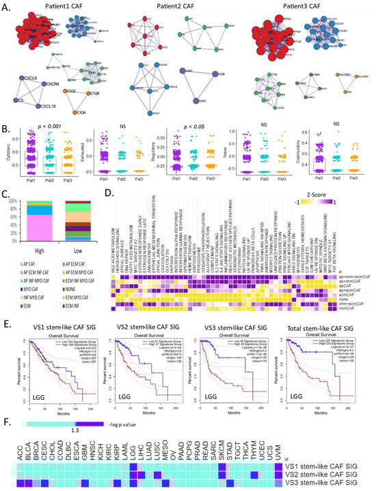 Although heterogeneity exists in cancer hallmark pathways, some pathways are commonly highly expressed (such as reactive oxygen species, xenobiotic metabolism, the p53 pathway, Notch signaling, and pancreatic beta cells). When only ecmCAFs were expressed, the cancer hallmark pathway was similar to that in the group lacking CAF signatures (Figure 4D). Our results were similar to those in which we confirmed the significantly higher apCAF levels in the high-immunity group compared with the low-immunity group (p < 0.001). The hallmark characteristics of cancer revealed a significantly higher difference; nonetheless, the CAF subtypes were distinguishable. Furthermore, we predicted the prognosis of low-grade gliomas using the gene signature identified in the CAF subtype of each of the three patients using single-cell data. These results differentiated the poor prognosis group from the high gene expression group (p = 0.023, VS1 stem-like CAF SIG; p = 1 × 10−4, VS2 stem-like CAF SIG; p = 1.5 × 10−9, VS3 stem-like CAF SIG; p = 7 × 10−7, VS total stem-like CAF SIG; Figure 4E). We used TCGA Pan-Cancer data to confirm that the CAF signatures (Supplementary Tables S1–S3) identified at the single-cell level aided prognosis. ApCAF and immCAF signatures were significantly (p < 0.001) more prognostic than ecmCAF signatures. In contrast, ecmCAF signatures in eight cancers confirmed poor prognosis in the high-expression group. We used the stem-like CAF signature to confirm prognosis in TCGA Pan-Cancer. VS3 stem-like CAF showed the largest differences (Figure 4F).