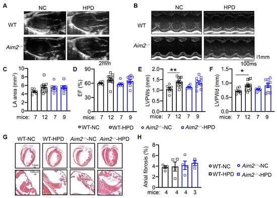 To determine whether structural remodeling within the atria or ventricular dysfunction contributes to the enhanced AF susceptibility in the HPD model, we performed echocardiography analysis prior to the PES studies. We found that the left atrial (LA) dimensions were similar among the four groups (Figure 4A,C). Additionally, we found that all four groups of mice displayed similar left ventricular (LV) ejection fraction (EF%, Figure 4B,D), LV diameters (ESD, EDD), and LV anterior wall thickness (LVAWs, LVAWd) (Supplementary Table S2, Figure S4). Interestingly, LV posterior wall thickness during both systole and diastole (LVPWs and LVPWd) was increased in WT-HPD and Aim2−/−-HPD compared to their NC-fed controls (Figure 4E,F), indicating that 4-week HPD may promote physiological LV hypertrophy. However, the mRNA levels of hypertrophic makers (e.g., Nppa, Myh7, and Mhy6) were not significantly different among the four groups in the ventricle sample of the mice (Supplemental Figure S4). To further evaluate whether HPD promotes fibrotic remodeling, a known pro-AF substrate, histology, and Masson’s trichrome staining were performed. We found that atrial and ventricular fibrosis were comparable among the four groups (Figure 4G,H). Protein levels of the macrophage markers (CD68 and F4/80) in atria were also comparable among the four groups (Supplemental Figure S5). These results establish that HPD promotes the development of a pro-arrhythmic substrate for AF unrelated to structural and fibrotic remodeling of the atria.