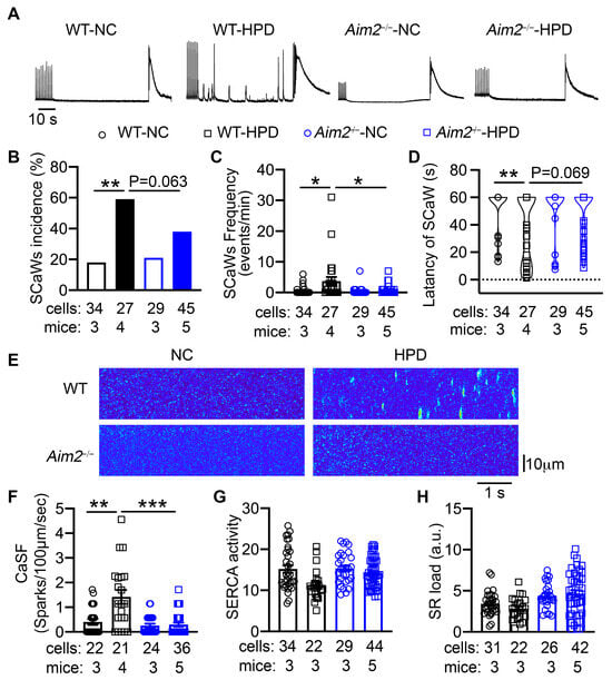 To determine whether HPD promotes abnormal SR Ca2+ release events, we performed Ca2+ imaging studies in isolated atrial myocytes from four groups of mice. After 1 Hz pacing, the incidence of spontaneous Ca2+ waves (SCaWs) was significantly higher in the atrial myocytes from WT-HPD than those of WT-NC mice (p < 0.05, Figure 5A,B). The frequency of SCaWs was also greater in the atrial myocytes of WT-HPD than those of WT-NC mice (p < 0.05, Figure 5C). The latency to onset of SCaWs was shorter in the cells of WT-HPD mice (Figure 5D). Consistently, the frequency of Ca2+ sparks (CaSF), mediated by clusters of ryanodine receptor 2, was increased in the atrial myocytes of WT-HPD mice (p < 0.01 vs. WT-NC mice, Figure 5F). The activity of SERCA, estimated by the decay of pacing-induced Ca2+ transients, as well as the SR load, were unchanged among the four groups (Figure 5G,H). In contrast, atrial myocytes of Aim2−/−-HPD mice displayed reduced incidence and frequency of SCaWs, delayed latency to the onset of SCaWs, and less CaSF compared with the cells of WT-HPD mice (Figure 5). These results suggest that HPD can promote abnormal Ca2+ release-mediated triggered activity, thereby enhancing atrial arrhythmogenesis, which can be attenuated by the inhibition of the AIM2 inflammasome.