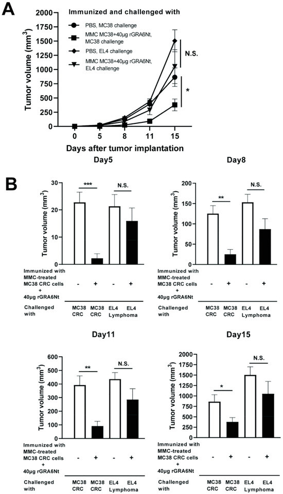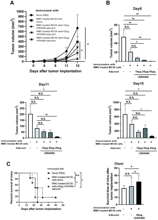 3.1. Immunization with MMC-Treated MC38 CRC Cells with rGRA6Nt Adjuvant Confers Potent Protections against a Challenge Implantation of This Cancer Cells in a Dose-Dependent Manner of the Adjuvant