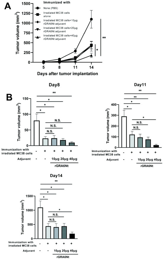 3.2. Immunization with Irradiated MC38 CRC Cells with rGRA6Nt Adjuvant Confers Potent Protections against a Challenge Implantation of This Cancer Cells in a Dose-Dependent Manner of the Adjuvant