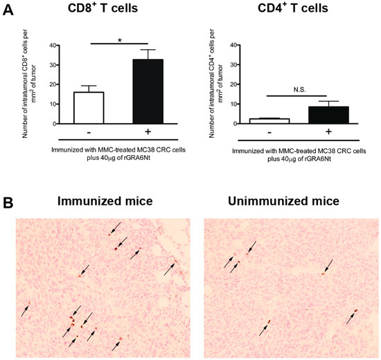 3.3. Immunizations with Non-Replicable MC38 CRC Cells with rGRA6Nt Adjuvant Induces Increased Infiltration of CD8+ T Cells into MC38 Tumors Implanted into These Mice