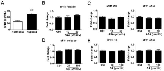 Low concentrations of aspirin (10 and 50 μmol/L) and salicylic acid (20 and 100 μmol/L) on hypoxia-induced sFlt1 protein release and mRNA expression in BeWo cells. (A) Hypoxia (1% oxygen, 24 h) induced sFlt1 release from BeWo cells. (B) Effect of aspirin on supernatant sFlt1 protein levels. (C) Effect of aspirin on sFlt1 mRNA expression. (D) Effect of salicylic acid on supernatant sFlt1 protein concentrations. (E) Effect of salicylic acid on sFlt1 mRNA expression. ASA, aspirin. SA, salicylic acid. Data are expressed as absolute values or fold changes relative to the control and presented as means ± SE, n = 4. ** p < 0.01.