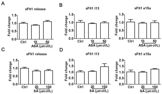 To confirm the above observations, we also examined the effects of aspirin and salicylic acid at LDA concentrations in a second trophoblast cell line, HTR-8/SVneo. Again, neither aspirin (10–50 μmol/L) nor salicylic acid (20–100 μmol/L) significantly reduced sFlt1 protein release (Figure 4A,C) or mRNA expression (Figure 4B,D). Salicylic acid at 100 μmol/L appeared to cause a non-significant increase of sFlt1 mRNA expression, but not at the protein level. Since we previously found that sFlt1 protein release and mRNA expression were not stimulated by hypoxia in this cell line [31], we did not test drug effects under this condition.
