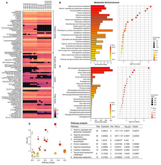 The Raw data files (‘-.d’) obtained from LC/Q-TOF-MS were converted to ‘-.cef’ format using Profinder 10.0 (Agilent Technologies). The converted data were further processed for peak finding, alignment, and identification in MassHunter Mass Profiler Profession 15.0. Enrichment and pathway analysis of the differentially identified metabolites was performed using MetaboAnalyst 5.0 (http://www.metaboanalyst.ca; accessed on 27 September 2023).