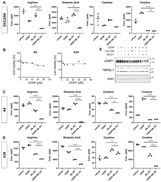 Downregulation of arginine contents by the combination of cisplatin with TRPML1 inhibition. (A) Targeted metabolomic analysis of arginine, glutamic acid, cysteine, and creatine in OVCAR8 cells using an Agilent 6470 triple quadrupole LC-MS/MS. (B) Assessment of cisplatin−resistance in ovarian cancer patient-derived cells, A8 and A39. (C,D) Targeted metabolomic analysis of arginine, glutamic acid, cysteine, and creatine in A8 and A39 cells using an Agilent 6470 triple quadrupole LC-MS/MS. (E) Determination of alterations in LAMP1 and TRPML1 expression by exogenous addition of arginine. Data are presented as mean ± SEM (* p < 0.05, ** p < 0.01, *** p < 0.001, **** p < 0.0001).