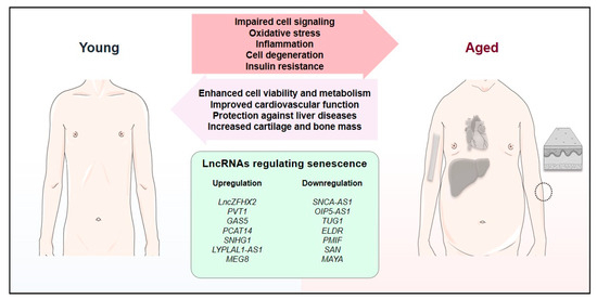 The impact of senescence-associated lncRNAs on the equilibrium between young and aged phenotypes. Aging is characterized by deleterious effects, including cell signaling dysfunctions, oxidative stress, inflammation, cell degeneration, and insulin resistance. Importantly, multiple lncRNAs can be regulated to revert these processes, resulting in enhanced cell viability and metabolism, as well as more specific effects, including improved cardiovascular function, protection against liver diseases, and increased cartilage and bone mass. In this figure, we included several examples of lncRNAs whose up- or downregulation could promote these effects though the inhibition of senescence.
