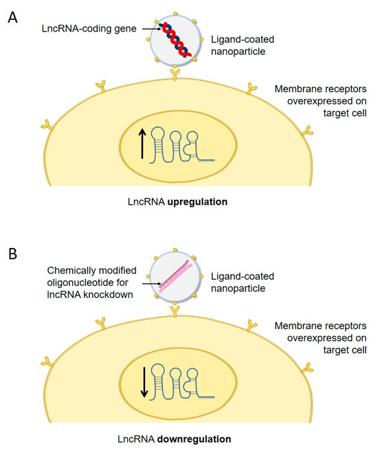Possible tissue engineering strategies for therapeutic up/downregulation of lncRNAs. Therapies could be based on nanoparticles coated with ligands recognizing a surface receptor overexpressed on target cells. (A) For upregulation, nanoparticles could be loaded with a lncRNA-expressing gene. (B) For downregulation, nanoparticles could be loaded with chemically modified lncRNA downregulatory oligonucleotides. LncRNA upregulation or downregulation are represented by upward or downward arrows, respectively.