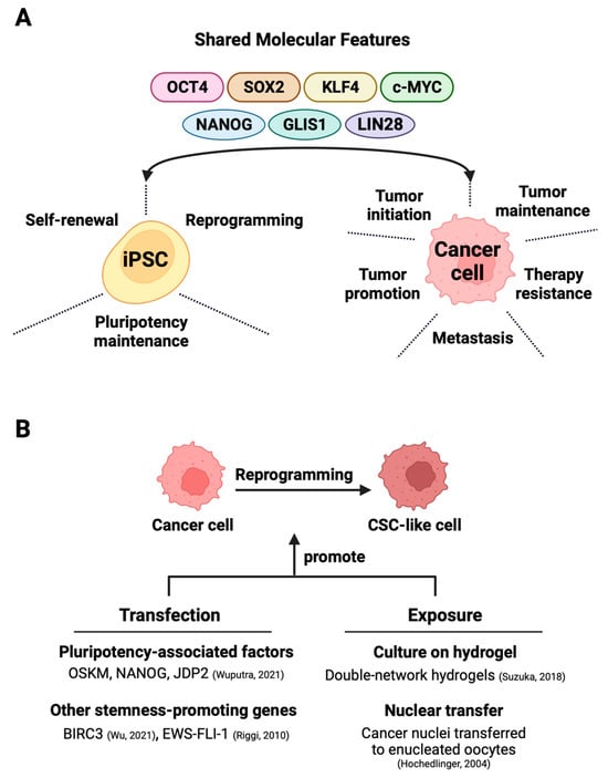 With the advent of iPSC technology, it has been possible to convert patient-derived somatic cells with cancer-predisposing germline mutation into iPSCs for disease modeling and therapy evaluation [123,124,125]. Beyond these goals, directed dedifferentiation of malignant cells can yield CSC-like cells (Figure 2B) for cancer research. The direct reprogramming of non-stem bulk cancer cells into CSC-like cells can occur through the transfection of either CSC-promoting protein-coding genes [26,82] or pluripotency-associated genes, which is discussed in great detail in this section. An alternative method for direct reprogramming utilizes exposure-based approaches to drive CSC formation by cancer cells (Figure 1B).