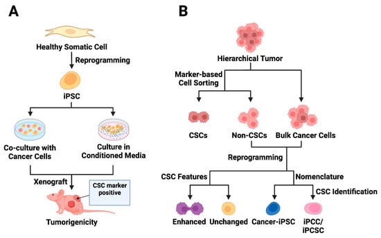 Exposure of normal stem cells to malignant niches has been proposed as a model for CSC origin [94,95,96]. Conforming to this hypothesis, CSC models were generated in vitro either by exposing normal iPSCs to conditioned media (CM) from cancer cells of different tissue origin [13,97,98,99,100] or by coculturing the iPSCs with the cancer cells [13] (Figure 2A). A seminal study involving various mouse cancer cell lines demonstrated that CM-dependent CSC derivation from mouse iPSCs (miPSCs) was more successful than the coculture method [13]. The CM-exposed miPSCs generally exhibited CSC-like properties by manifesting self-renewal in sphere-formation assays and forming tumors when transplanted into nude mice [13,97,98,99,100]. A noteworthy observation is that tumors derived from different CM-based CSCs exhibit varying angiogenic and metastatic potential apparently due to the difference in the expression of metastasis and angiogenesis regulators, such as IFNγ and MMPs, in corresponding CSCs [13].