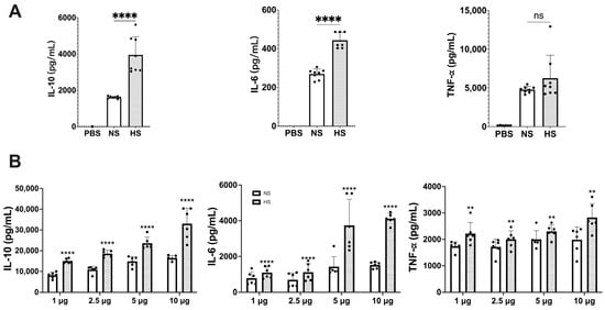 Cytokine responses in (A) mouse macrophages and (B) mouse spleen cells stimulated by NS and HS. (A) RAW 264.7 cells (1 × 106 cells/well) were incubated with 5 μg protein of NS or HS. After 48 h of stimulation, IL-10, IL-6 and TNF-α production in culture supernatant was determined by ELISAs (ns: not significant, ****: p < 0.0001, statistical analysis by unpaired Student’s t-test, n = 8 from 2 independent experiments). (B) Mouse splenocytes (5 × 106 cells/well) were incubated with 1 μg, 2.5 μg, 5 μg, and 10 μg of NS or HS. After 48 h of stimulation, IL-10, IL-6, TNF-α production in culture supernatant was determined by ELISAs. The IL-10, IL-6 and TNF-α levels between NS and HS have significant differences (p < 0.0001, statistical analysis by two-way ANOVA, n = 6 from two independent experiments). Each dose between NS and HS in IL-10, IL-6, and TNF-α has significant differences (**: p < 0.0021, ****: p < 0.0001, statistical analysis by Tukey’s test).