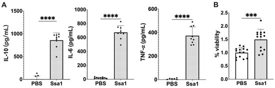 Effect of C. albicans Ssa1 on (A) cytokine production and (B) viability of mouse BMMs. (A) BMMs (1 × 105 cells) were seeded in 24-well plates and treated with or without 5 μg Ssa1. After 48 h of stimulation, the production of IL-10, IL-6, and TNF-α in the culture supernatant was determined by ELISAs. The production of IL-10, IL-6, and TNF-α in Ssa1-treated macrophages was significantly higher than that in the untreated control group. (****: p < 0.0001, statistical analysis by unpaired Student’s t-test, n = 9 from three independent experiments) (B) BMMs (1 × 104 cells/well) were seeded in a 96-well plate and treated with or without 0.5 μg Ssa1. After 24 h of incubation, the culture supernatant in each well was replaced with 100 μL of fresh medium containing 10 μL of cell proliferation reagent (WST-1; Roche). After color development, the absorbance at 420 nm was measured using the absorbance at 600 nm as a reference wavelength. Cell-free medium was used as a blank, and the absorbance of BMMs without Ssa1 was calculated as 100% viability (***: p < 0.0002, statistical analysis by unpaired Student’s t-test, n = 14 from three independent experiments).