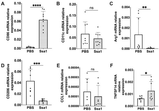 Relative mRNA expression of the markers associated with macrophage polarization in Ssa1-treated BMMs. BMMs (1 × 105 cells) were seeded in 24-well plates and treated with or without 5 μg Ssa1. After 24 h of treatment, total RNA from the cells was extracted, and cDNA was synthesized and used as a template for RT-qPCR. mRNA levels were normalized according to the expression level of GAPDH. Results were expressed using the ΔΔCt method for quantitation. (A) CD86, (B) CD11c, (C) Arg1, (D) CD206, (E) CCL1 and (F) TNFSF14 (ns: not significant, *: p < 0.0332, **: p < 0.0021, ***: p < 0.0002, ****: p < 0.0001, statistical analysis by unpaired Student’s t-test, n = 8 from 3 independent experiments).