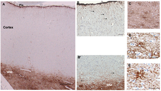 Superior frontal cortex shows CD44 positivity in subpial (Pia), interlaminar astrocytes, and white matter (WM) astrocytes, but not in the protoplasmic astrocytes of the cortex (A). Higher magnification of the pial surface and upper cortex shows the long interlaminar processes, radial to the pial surface (arrows) (B). Higher magnification of the white matter and lower cortex shows long astrocyte processes emerging into the cortex (arrows) (B’). (B,B’) are not from (A) but from other specimens, but all cortical specimens show the same pattern. The subcortical white matter contains dense astrocyte processes (C). Higher magnification of white matter astrocytes, which extend long processes in many directions, although the longest processes are roughly parallel and in the direction of axonal tracts (D,E). All specimens are counterstained with hematoxylin. Scale bars: (A) 250 μm, (B) 50 μm, (C) 25 μm, (D,E) 20 μm.