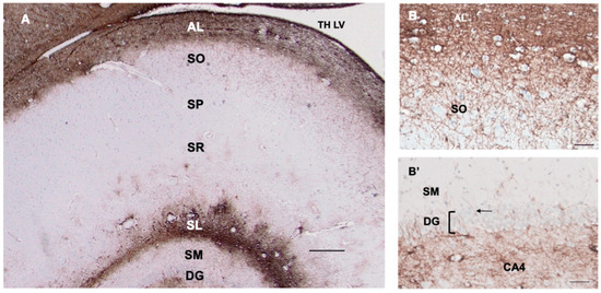 A section through the layers of the hippocampus (A) show CD44 positivity in the alveus (AL) and stratum lacunosum (SL). Thin, unbranched CD44+ processes run through the stratum oriens (SO) toward the pyramidal layer (stratum pyramidale, SP) (A,B). CD44+ processes do not surround pyramidal cells. Astrocytes in the stratum pyramidale, stratum radiatum (SR), and stratum moleculare (SM) show little CD44 reactivity. Dentate gyrus (DG). A higher magnification (B) shows the radially oriented processes in the SO. A higher magnification also shows the CD44+ processes (arrow) emanating from the subgranular zone of the CA4 sector through the dentate gyrus (DG, bracket) into the stratum moleculare (B’). (B,B’) are from a different specimen than (A), but all hippocampal specimens show the same patterns. Temporal horn of the lateral ventricle (TH LV). All specimens are counterstained with hematoxylin. Scale bars: (A) 250 μm, (B,B’) 200 μm.