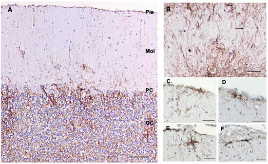 - Colombo, J.A.; Gayol, S.; Yanez, A.; Marco, P. Immunocytochemical and Electron Microscope Observations on Astroglial Interlaminar Processes in the Primate Neocortex. J. Neurosci. Res. 1997, 48, 352–357. [Google Scholar] [CrossRef]