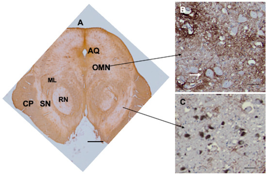 The midbrain appears complex, with CD44 staining of white matter tracts such as the cerebral peduncles (CP) and medial lemniscus (CP). The red nucleus (RN) contains CD44+ astrocytes. The substantia nigra (SN) appears relatively free of CD44+ staining (A). Neurons of the oculomotor nucleus (OMN) are surrounded by CD44+ staining (arrow shows one of these neurons) (B), but neurons of the substantia nigra are not (C). Aqueduct of Sylvius (AQ). Scale bars: (A) 5 mm, (B,C) 25 μm.