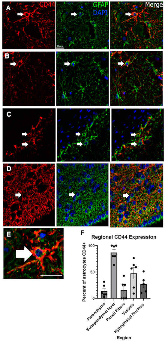 To quantitate the proportion of GFAP+ cells that are also CD44+, we counted the double-labeled cells in the caudate nucleus, including the parenchyma (gray matter only) subependymal region, the pencil fibers (white matter tracts), and around small arteries and then in the hypoglossal nucleus (Figure 9). Examples of double-labeled cells are provided in Figure 9A–E, and the quantitation of the proportion of GFAP+ cells that are also CD44+ in Figure 9F).