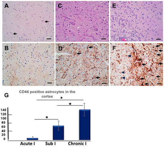 Protoplasmic astrocytes in the isocortex stain for CD44 following hypoxic/ischemic conditions. (A–F) represent acute, subacute, and chronic infarcts, respectively. Eosinophilic neurons (arrows) are seen in (A). Proliferative vasculature is present in (C). Foamy macrophages are more pronounced in (E) in an area of necrosis (left side of the panel). (B,D,F) are immunohistochemical stains for CD44 in the same tissue samples and hypoxic areas as shown in (A,C,E), respectively, but not the same fields. CD44+ astrocytes are highlighted (black arrows). Macrophages (arrowheads) are also positive for CD44. The vessels are outlined by CD44 stain. Specimens in (A,C,E) are stained with hematoxylin and eosin. Specimens in (B,D,F) are counterstained with hematoxylin. Scale bars: 20 μm. (G) The numbers of CD44+ astrocytes increase as infarcts evolve (average numbers in three 20X fields/specimen). Acute I: acute infarct; Sub I: subacute infarct; Chronic I: chronic infarct. (* p < 0.01, Sub I vs. Acute I, * p < 0.01, Chronic I vs. AI; * p < 0.01, Chronic I vs. Sub I). ANOVA with Tukey post hoc analysis. Values are shown as means ± SEM.