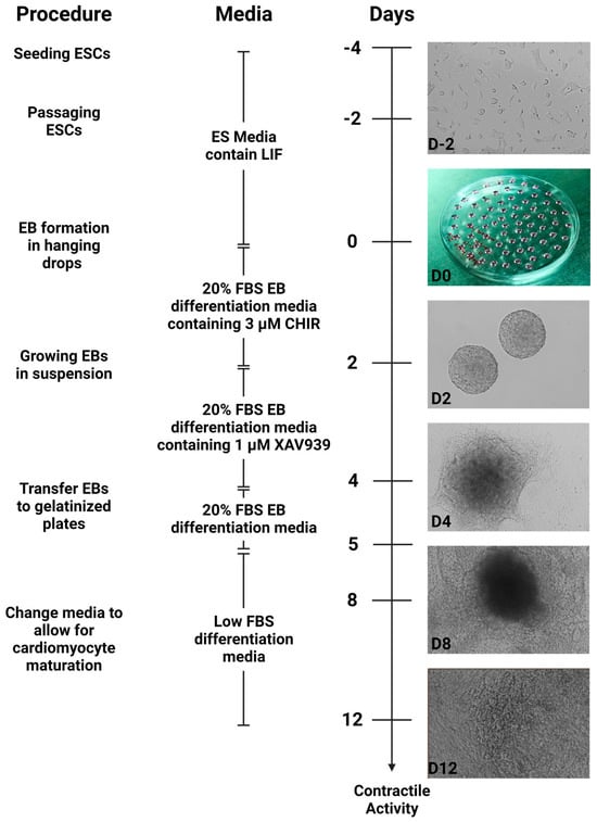 Briefly, mouse ESCs were cultured for at least two passages after thawing using the medium containing the leukemia inhibitory factor (LIF). To begin differentiation, the cells were cultured in 20% differentiation medium supplemented with CHIR99021 as hanging drops. Uniform, rounded embryoid bodies were formed on day 2 (D2) of differentiation (Figure 1). The embryoid bodies were transferred to petri plates in the differentiation medium supplemented with XAV939. On day 4 of differentiation (D4), an increase in embryoid body size was observed, with cells beginning to attach to the surface of the petri plates (Figure 1). After transferring embryoid bodies to gelatinized plates, significant morphology changes were observed, with cells growing out of the embryoid body core to generate a monolayer sheet of attached cells by day 8 (D8). These sheets of cells also displayed contractile activity, which continued to increase through day 12 (D12) of differentiation (Figure 1, Supplementary Video S1).