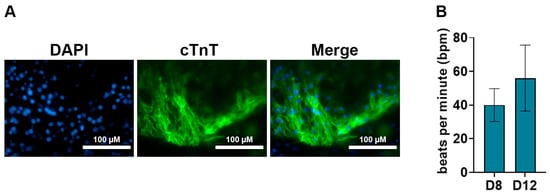 A key feature of cardiomyocytes is their unique morphology and sarcomere structures. This morphology can be visualized using immunostaining against cTnT, cTnI, MLC2a, and α-actinin. To characterize the efficient differentiation of ESCs into cardiomyocytes using our method, we performed immunostaining against cTnT on day 12 post-differentiation. Our data showed a positive immunostaining of cTnT in day 12 cardiomyocytes (Figure 5A). Additionally, we measured the contractile activity of the cardiomyocytes by measuring the beats per minute (bpm) using videos obtained from brightfield microscopy. We observed a mean bpm of about 40 and 60 at D8 and D12 respectively, which are similar to rates previously reported [31].