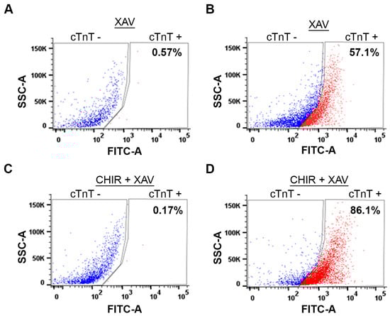 Next, we compared the yield of cardiomyocytes generated by the WNT Switch method with a currently used method [30], which utilizes only XAV939 treatment using fluorescence-activated cell sorting (FACS). Briefly, cardiomyocytes were dissociated, fixed, and stained with anti-cTNT and AlexaFluor-488 antibodies. As a negative control, we stained dissociated cardiomyocytes with the AlexaFluor-488 antibody without the anti-cTnT antibody (Figure 6A,C). Following FACS analysis, the induction of cardiomyocytes from XAV939 treated cells yielded about 57.1% cardiomyocytes (Figure 6B), similar to the 58.7% yield previously published [30]. As expected, our method for cardiomyocyte induction generated about 86.1% yield (Figure 6D). The 30% increase in the yield of cardiomyocytes demonstrates the robustness of the WNT Switch method.