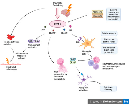 Further release of proinflammatory cytokines such as IL-1β and IL-6 facilitates the recruitment of peripheral immune cells into the site of injury. When neutrophils traverse the BBB, they exacerbate leukocyte activation, proinflammatory cytokines levels, and incite brain tissue swelling Figure 1.
