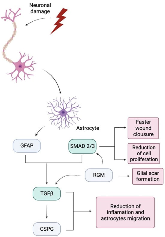 - Zhang, R.; Wu, Y.; Xie, F.; Zhong, Y.; Wang, Y.; Xu, M.; Feng, J.; Charish, J.; Monnier, P.P.; Qin, X. RGMa Mediates Reactive Astrogliosis and Glial Scar Formation through TGFβ1/Smad2/3 Signaling after Stroke. Cell Death Differ. 2018, 25, 1503–1516. [Google Scholar] [CrossRef] [PubMed]